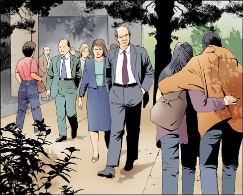 Como todos somos hijos de un mismo Padre, todos somos hermanos. Terminaremos el análisis de este artículo con una hermosa definición del Cristiano que nos ofrece San Pablo. Definición que retomamos, pero completándola: «Si el prójimo es hijo de Dios, es porque Cristo vive también en él». Y precisamente, el artículo 5 nos invita a buscar a la persona viviente y operante de Cristo en el prójimo. Por ejemplo, para las personas casadas, el primer prójimo es su propio cónyuge. Una idea muy extendida proclama que el día del matrimonio representa forzosamente la cima de la felicidad que puede existir en la vida de una pareja y que, tras este bello día (al que por otra parte tampoco debemos minimizar), el amor va disminuyendo, incluso anquilosándose, con el correr del tiempo. Es muy triste abandonarse a esta creencia. ¿No debemos más bien buscar en el cónyuge, tras dos, cinco, diez, veinte o cuarenta años de vida común, a la persona viviente y operante de Cristo? Descubriremos así que el Amor se expresa con fuerza en las cosas más sencillas, en las que seguramente son menos visibles ante los ojos del mundo. Cuando posamos esta mirada en el prójimo, el mundo se transforma y el Amor, en vez de anquilosarse, crece sin parar. ¿Alguna vez has visto un roble crecer? El pequeño arbusto, de follaje verde pálido en sus primeros años, necesita muchos cuidados. Con frecuencia es necesario podar los abrojos que proliferan a su alrededor, cuyo rápido crecimiento puede llegar a ahogarlo. La planta, pues, es frágil en su tierna belleza. Luego pasan los años. Sin hacer ruido, sin que nadie se dé cuenta, la planta crece y se llena de hojas. El arbusto se vuelve árbol. El verde pálido cede su lugar a un verde encendido. Ahora los abrojos no pueden hacerle daño, pues el tronco eleva el ramaje. Cada año, el árbol da frutos. Cada año, el árbol protege a los pájaros del cielo que vienen a buscar refugio entre sus ramas. No obstante, este árbol ha sufrido, como todos los árboles, lluvias, tormentas e incluso tempestades, pero la mirada dirigida al otro le ha permitido desarrollarse en la belleza, la majestuosidad, la longevidad, la alegría y la felicidad. ¡Sí, la felicidad!