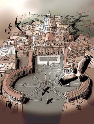 La primera fase es común a todos los hombres, es decir que cada individuo, ya sea cristiano, miembro de otra religión, adepto a una secta, ateo o adversario incondicional de la Iglesia de Cristo, tiene un alma espiritual, inmortal, creada por Dios. La segunda fase es propia de los justos que, por voluntad, llevan al alma a una creación aún más completa, uniendo sus buenas acciones a la bondad del trabajo de Dios. En consecuencia se forjan un alma más perfecta espiritualmente que aquellas que permanecen en la primera fase. La tercera fase es la de los bienaventurados, los santos, que agrandan miles y miles de grados el alma que tenían al principio, un alma simplemente humana a la que convierten en un alma capaz de reposarse en Dios * Según Valtorta, María, El Evangelio como me ha sido revelado, Centro Editoriale Valtortiano, Isola de Liri, Italia, 1999, vol. 3, cap. 204 (extractos).. Para comprender bien esta progresión, tomemos como símbolo un edificio religioso que todo el mundo conoce: la iglesia de san Pedro en Roma. Primero, su gran plaza, adornada y robusta, introduce al peregrino en el área del edificio. Está defendida por dos gigantescas series de columnas implantadas en forma de círculo, como si se tratara del muro de defensa de la fortaleza de un castillo.