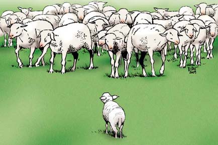 Noventa y nueve ovejas lo miran sin moverse.