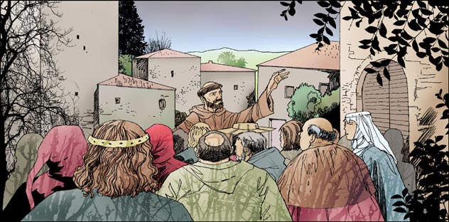 Cuando Francisco comienza a recorrer Umbría para anunciar la Buena Nueva, el norte de Italia está infestado de sectas, en particular de cátaros. El joven predicador no ataca de frente a los herejes; no pierde el tiempo en polémicas. Pero movido por el Espíritu, se dirige espontáneamente a la esencia evangélica, revelando ante los ojos de todos aquello que había tocado y conmovido lo más íntimo de su ser: la insondable humanidad de Dios. Y entonces sucedió algo único: sin violencia, sin cruzada, sin Inquisición, las sectas desaparecieron de Italia, «como pájaros nocturnos huyendo ante los primeros rayos del sol». ¡Ah!, el señor hermano sol, a través de quien nos das, Tú el Altísimo, el día y la luz. Es bello y radiante con gran esplendor y por Ti, nos invita cada día a vivir el Evangelio.