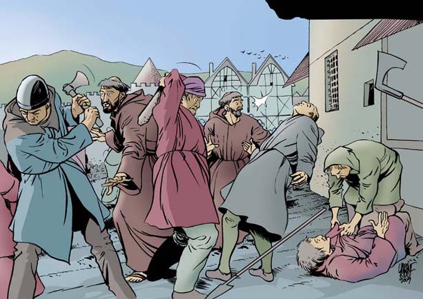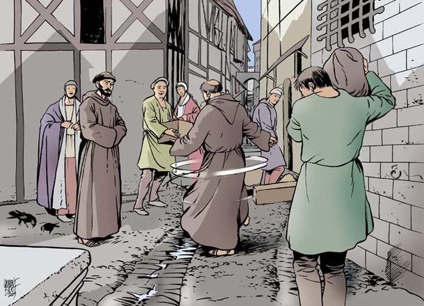 Cuando se va llegando a Siena, los habitantes salen a su encuentro. Han sido advertidos por viajeros más rápidos que nuestros amigos, que les han dado esta noticia: “El santo hombre de Asís llega con uno de sus compañeros”. La gente se lanza a los pies de los dos hermanos menores, espantada. “¡Venid rápido! Los sieneses pelean entre ellos a causa de un lío de faldas, aunado a un sombrío problema de dinero. Ya ha habido dos muertos y hay riesgo de que esto continúe si no se hace nada por restablecer la paz”. Francisco y Maseo apuran el paso y se dirigen al centro de la batalla. Gritos, injurias, golpes, sangre que corre. Este es el horripilante espectáculo que descubren al llegar. “¡Deteneos, habitantes de Siena! ¡Deteneos y escuchad!”, grita Francisco. “Escuchad esta parábola”.